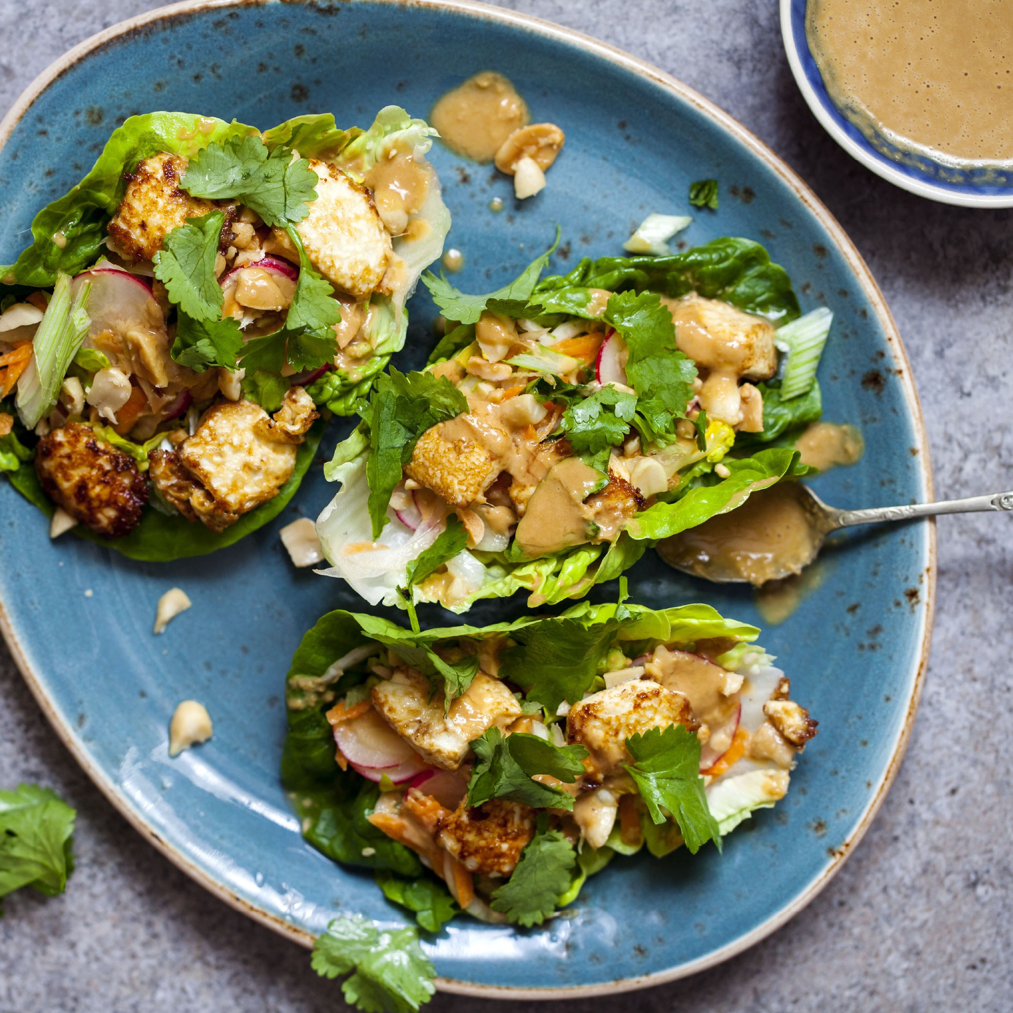 4. Mix tofu into vegetables with sweet chili, add radish slices and place onto lettuce wraps and top with wonton crisps