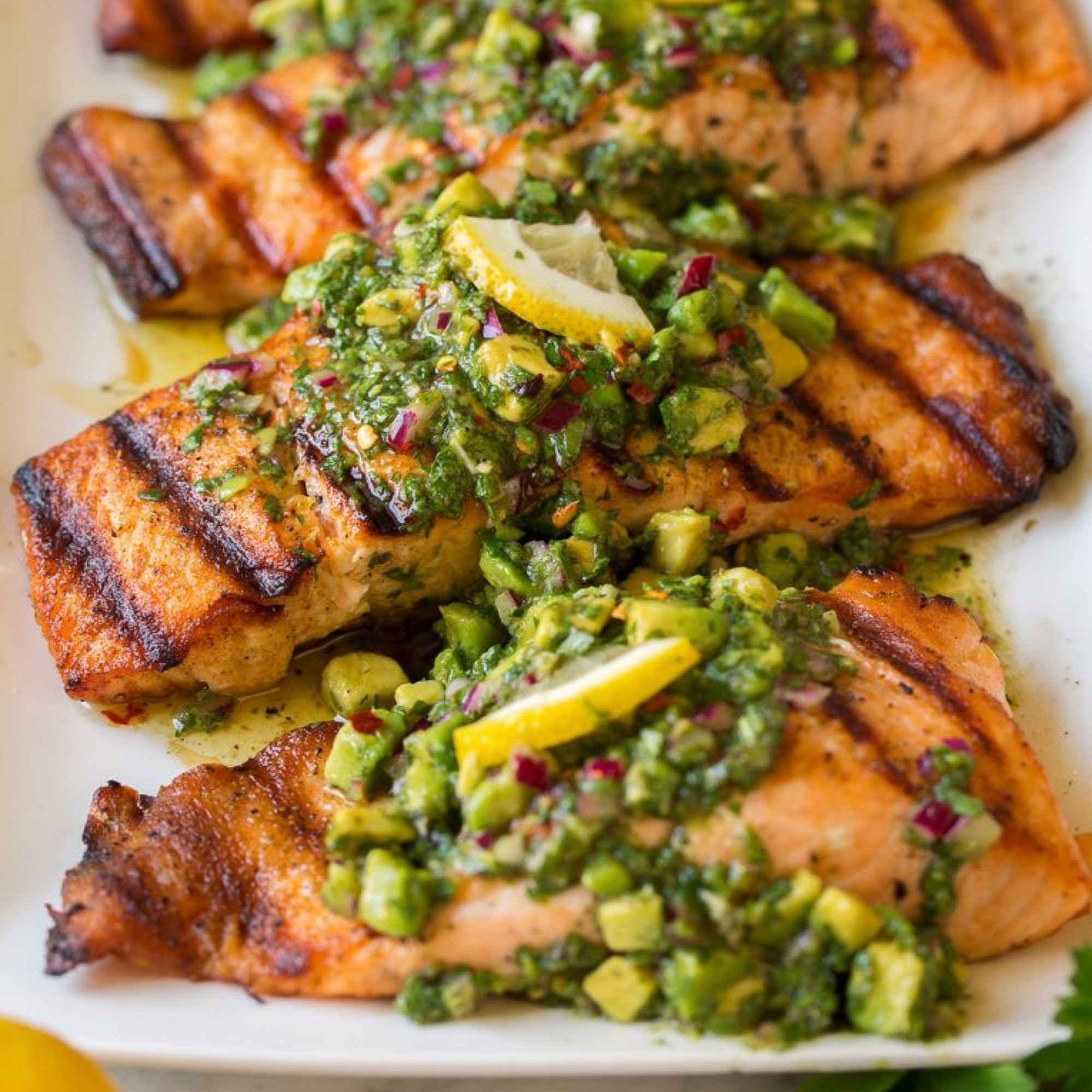 - Étendre le chimichurri à l’avocat sur le saumon chaud et garnir de quartiers de citron avant de servir.